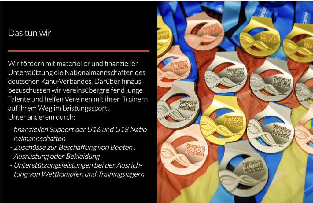 Unser Ziel: Die Förderung und Weiterentwicklung, besonders die finanzielle Unterstützung unserer Sportlerinnen und Sportler im Kanu-Slalom in Deutschland. Seit vielen Jahren setzen wir genau dort den Hebel an, wo die üblichen Mechanismen nicht greifen.